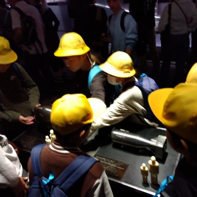 平和公園内の碑などをグループ行動で見学しました。平和記念資料館の下に集合した後、資料館の見学が始まりました。手をつなぎ合って一つ一つの展示を見ている子たち、友だちに肩を抱えてもらいながら見られる範囲で学んでいる子。小声で感じたことを伝え合ったり、不安がる子に「これは大丈夫やで」と声かけたりして、大切な時間を共有しました。
