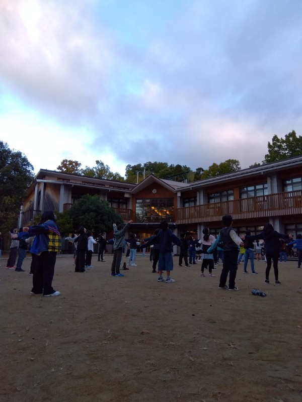 爽やかな空気の中で朝の集いが始まりました。実行委員の挨拶の後、全員で準備体操です。