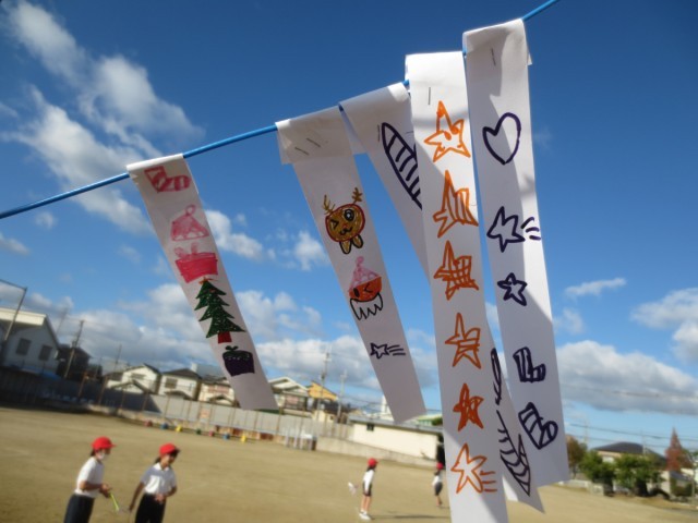 松小っ子1年生が体育の時間に、図工の作品を持って走っていしました。