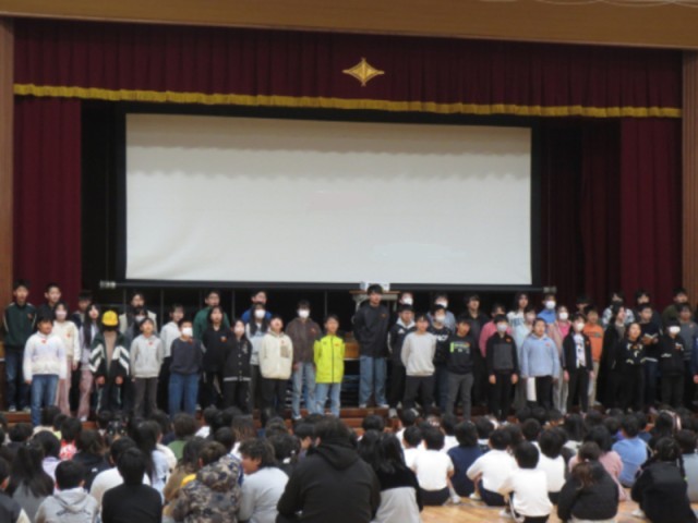 児童朝会で、5年生が2学期に行った林間学校の報告発表をしました。