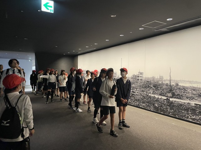 資料館の見学を始めています。修学旅行の人だけでなく、たくさんの外国の方がおられます。混んでいますが、何か一つでも心に残してください。