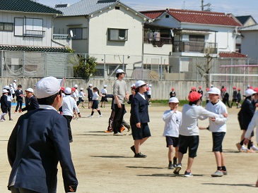 4月12日(金)、今日は、とても心地よい気候でした。運動場では、先生も加わって鬼ごっこなどの遊びが繰り広げられていました。