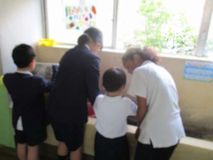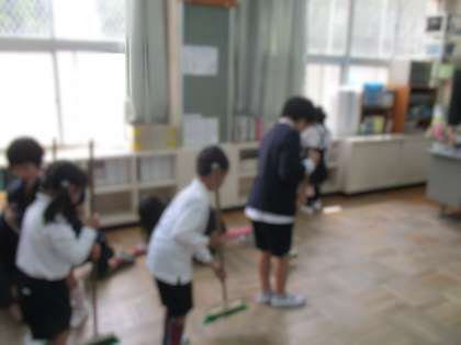 はじめてのそうじをしました。ほうきの持ち方、ぞうきんのしぼり方、つくえの運び方など、6年生に丁寧に教えてもらい、教室をピカピカにすることができました。