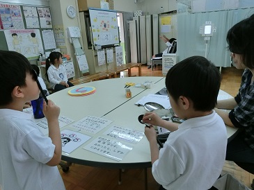 4月は、どの学年も様々な保健行事が続きます。今日は、1年生が小学校に入学して初めての視力検査を行いました。「うえ」「した」「みぎ」「ひだり」と一生懸命に答えていました。また、自分たちが使った器具は、自分で消毒を行いました。これも初めての体験です。