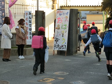 1月5日(火)〜7日(木)の登校時間に合わせて、PTA学年対策部員の方々が挨拶運動として、正門と西門に立ってくださいました。寒さが厳しいくなる中、早朝より、ありがとうございました。