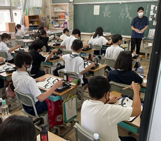 5年生で習いはじめた家庭科。なみぬいから返し縫いまで、とっても細かい作業ですが、丁寧に頑張っています。習字では、「成長」の練習です。はねやはらいを練習してから、いよいよ本番です。