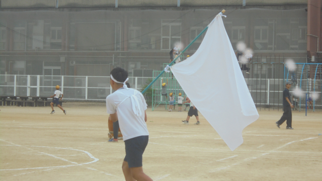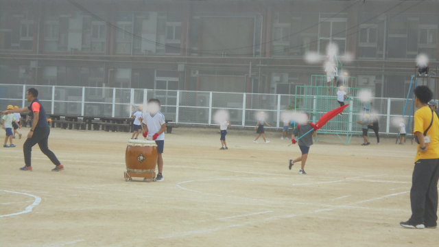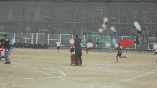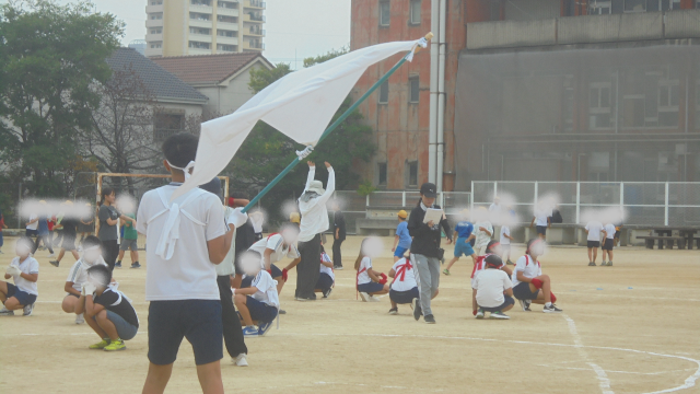 応援団の練習です。太鼓と団長さんのかけ声に合わせて、一斉に動いています。みんなで、運動会を盛り上げるために頑張ってくれています。