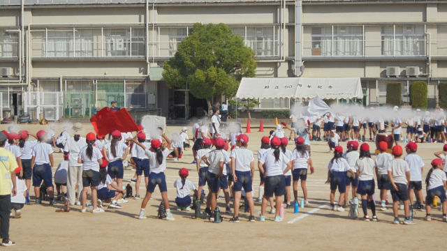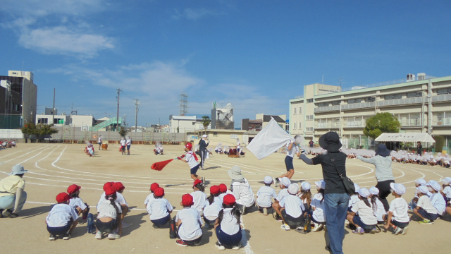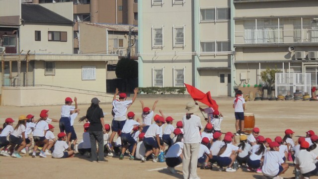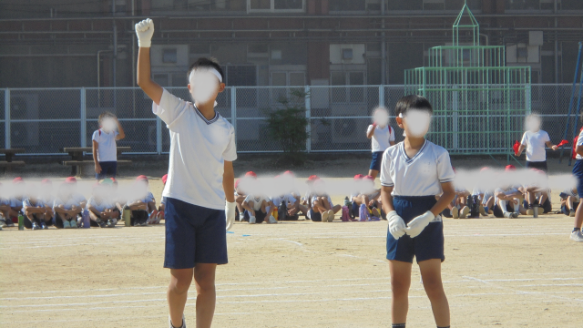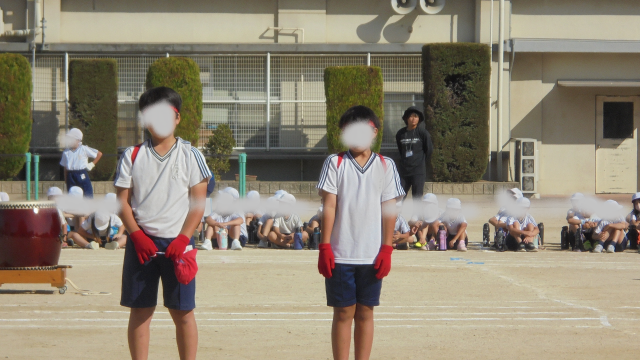 応援合戦の練習です。応援団の団員のお兄さん、お姉さんの掛け声に合わせて、大きな声で声援する練習をしました。騎手が前を通る時にはウェーブで盛り上げます。