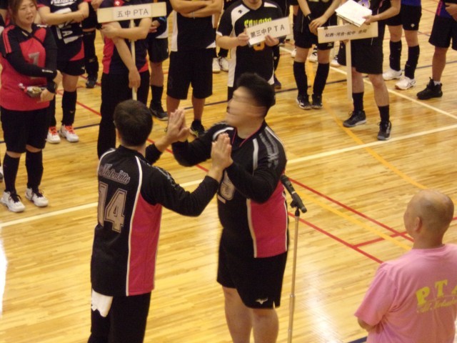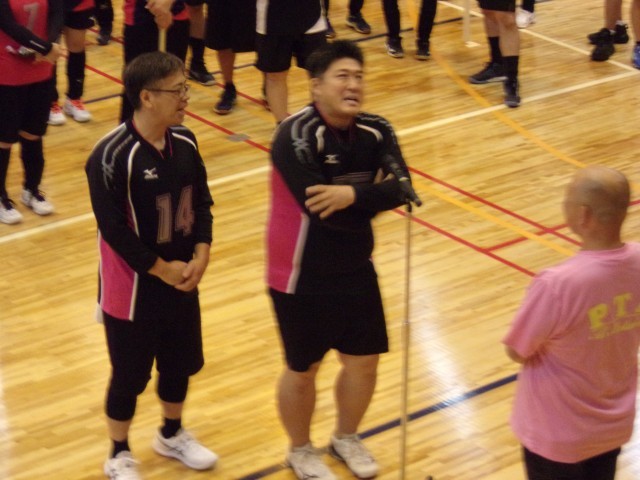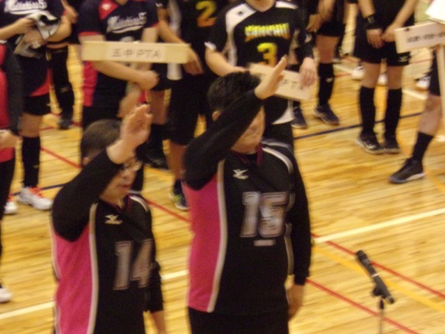 今年の選手宣誓は、なんと松北小・四中合同チームが担当しました。しかも、松北小のお父さん方です。なんともユニークな選手宣誓でした。会場の笑いを誘っていました。最後は、ビシッと決めて、選手宣誓をされました。