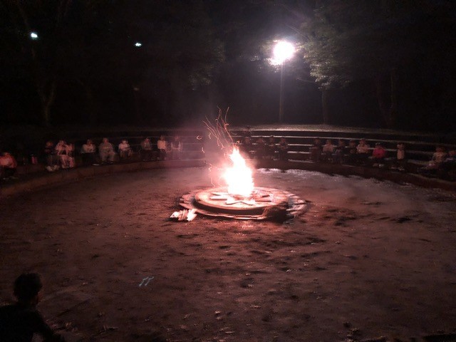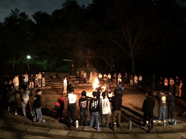 いやいよキャンプファイヤーが始まりました。火の女神様から火を授かり、みんなの気持ちを表しているかのように勢いよく高く燃え上がりました。