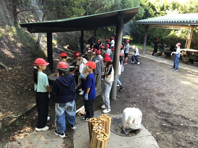 各班、材料を切り終わり火の準備もできました。いよいよ、ご飯を炊いて、カレーを作ります。みんな気になって仕方なく、釜の近くに集まっています。片付けも頑張ろう。食べる食器の用意も頑張っています。