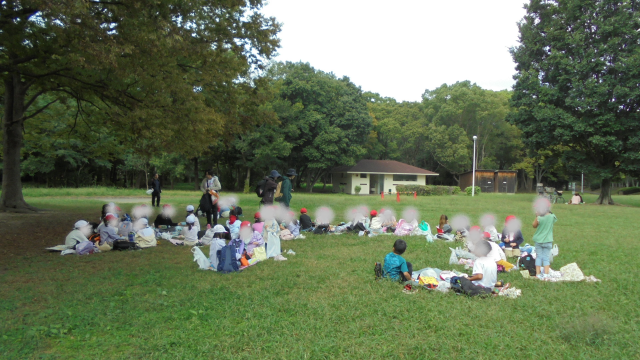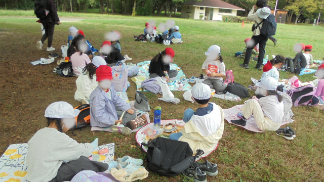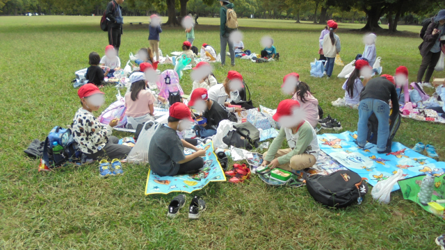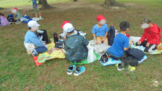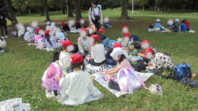 遊具で思いっきり遊んだらお腹がすいたようです。「先生~お腹すいた~お弁当、まだ~?」という声があちこちから聞こえてきました。中央にある芝生の広場に向かいました。さぁ、待ちに待ったお弁当タイムです。愛情のたっぷりつまったお弁当です。みんなで手を合わせて「いただきまぁ~す!!」しっかり食べてね(#^^#)