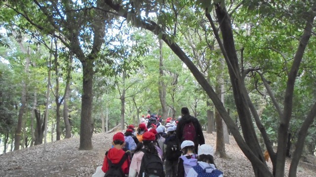 お弁当タイムを終えて、移動中の様子です。今度は、松ぼっくりを探します。