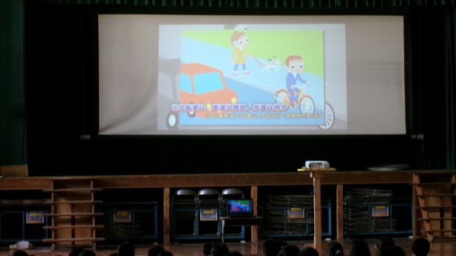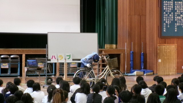 松原警察の方による交通安全指導がありました。低学年と高学年にわかれて、信号などの交通ルールや自転車の点検の方法、乱暴な走行による事故、車の死角などの紹介もあり、道路を安全に走行するためのお話などいろいろと教えていただきました。「ハラブタベサ」は自転車を点検するときの項目です。ハンドル、ライト、ブレーキ、タイヤ、ベル、サドルの6つをお家で確認してみてください。