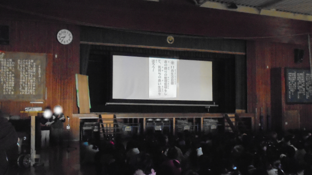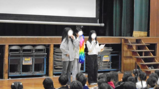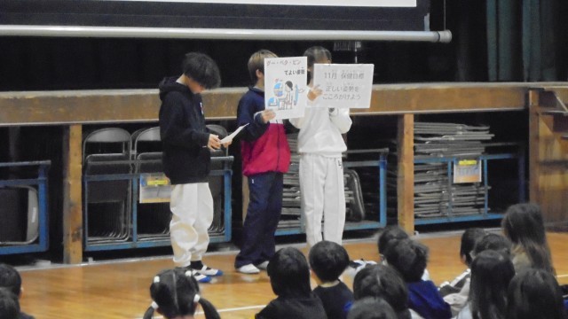 児童朝会の様子です。明日から6年生が修学旅行に出発するのを前に、出発式をしました。6年生の代表が、広島に行くことや平和について学んでくること、みんなが平和を祈りながら一生懸命に折ってくれた折り鶴を慰霊碑にさげてくることなどを話しました。広島で一人ひとりが、平和の大切さを肌で感じ、学んできて欲しいと思います。他には、児童委員会、保健員会からの連絡がありました。児童委員会からは、下駄箱にきちんと靴をならべていこうという取り組み、保健委員からは、正しい姿勢で授業を受けようという呼びかけでした。みんなで一生懸命取りくみましょう!!