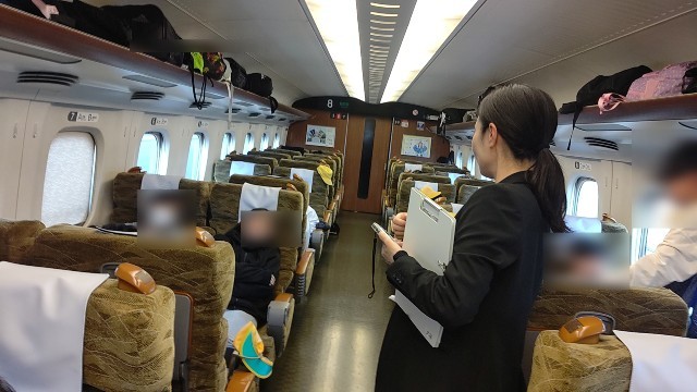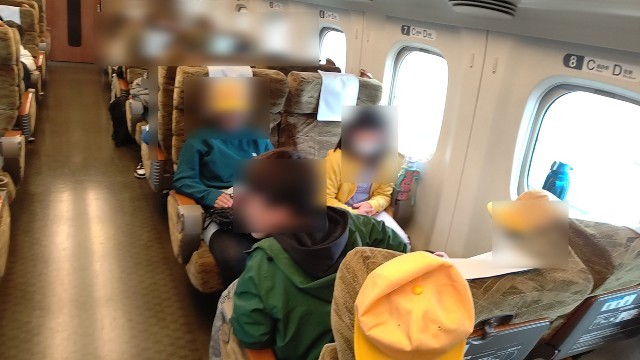新幹線の中でおしゃべりしたり、カードゲームをしたり楽しんでいます。あと20分ほどで広島駅に到着します。