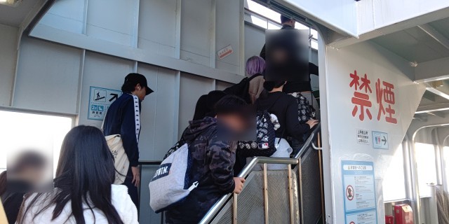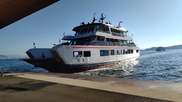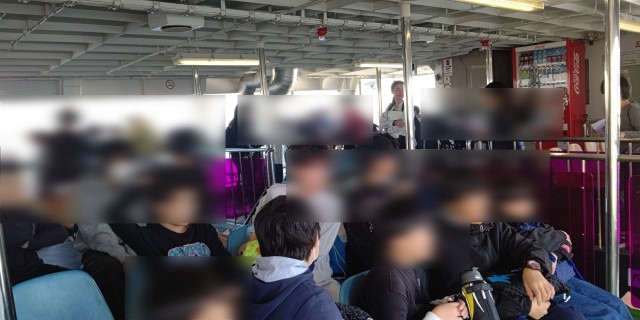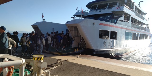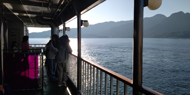 フェリーにのりました。朝の太陽がキラキラしていて、とても綺麗です。
