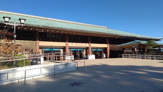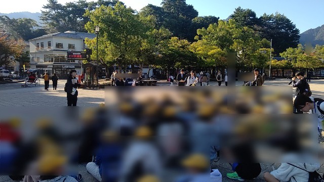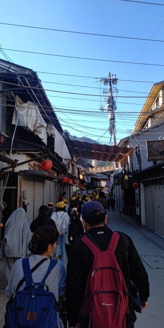 実行委員さんの話を聞いた後、お土産屋さんを通り厳島神社に向かっています。何を買おうかな?口々に話をしながら歩いています。