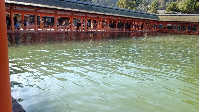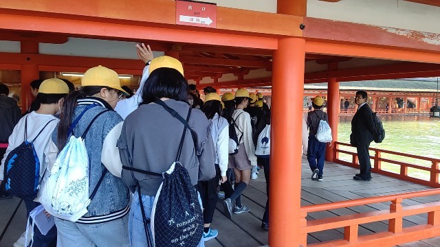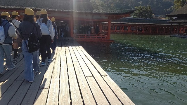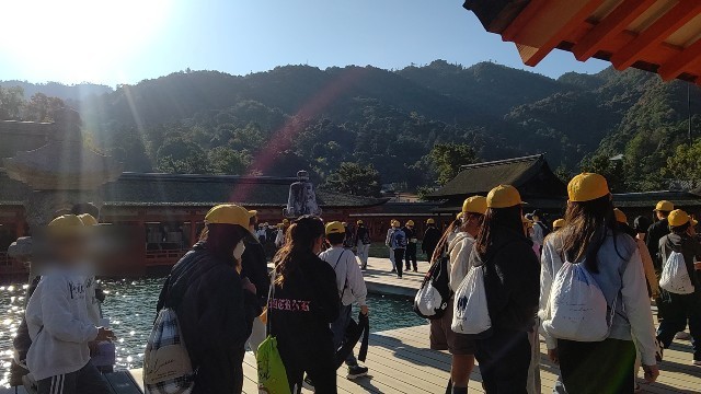 厳島神社です。このあと、満潮時で拝観を見合せると放送が入りました。松北小は、ギリギリ拝観できました。