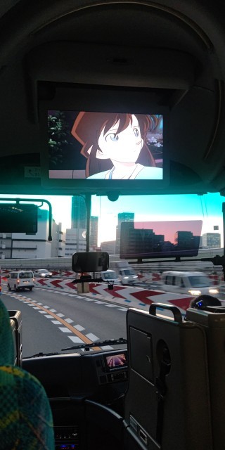 バスの中では、名探偵コナンのDVDを見ています。乗っているバスはMITSUWAバスです。赤色です。