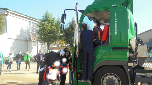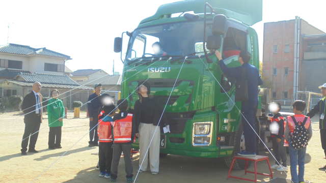 大きなトラックの死角について学びました。20トントラックの運転席に乗せてもらったり、トラックの前の部分に立ったりして、運転席から見えないことを学びました。私も運転席に座らせていただきましたが、ミラーがいくつもついていますが、本当に恐ろしく思いました。小学生ぐらいが運転席の死角に入り込んだらと考えたら背筋が凍る気持ちになりました。貴重な体験です。
