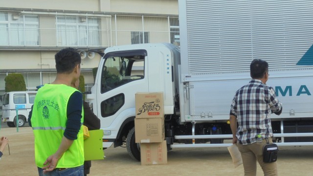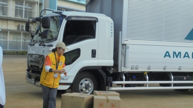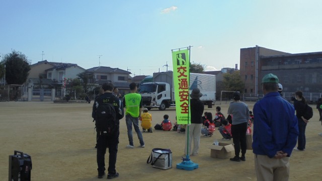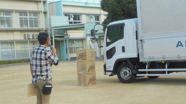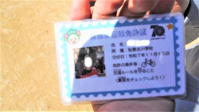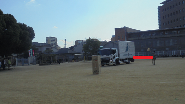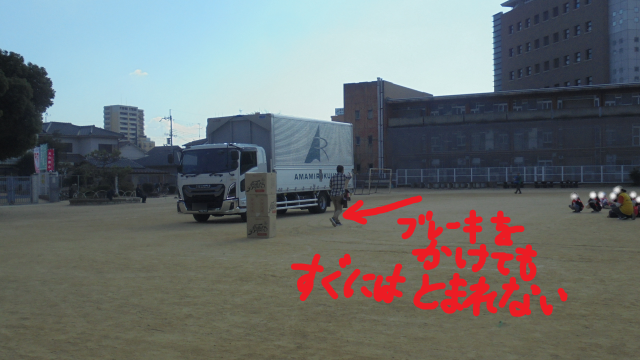 安全教室の最後は、車には内輪差があることを実際にトラックを走らせて見せてもらいました。人に見立てた段ボールは、トラックに当たって崩れました。これが子どもだったらと思うと本当に恐ろしいです。また、車は急に止まれないことも見せて貰いました。自転車運転免許証とお土産をもらって今日の北っ子デー(土曜子ども体験)は終わりました。皆さま、朝の早くからありがとうございました。