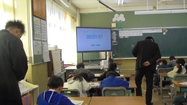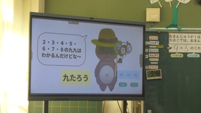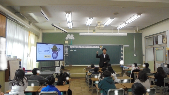 今日は、2年生のかけ算の学習です。9×5の計算の仕方を考えます。市役所の先生も見に来てくれました。9の段の九九は、まだ学習していません。習ったかけ算を使ってどう計算するのでしょうか。どのように計算するのかを説明するのは難しいですが、子どもたちは、一生懸命に考えていました。