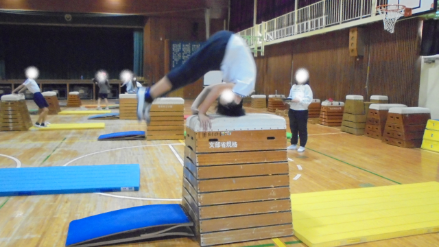 体育館で跳び箱をしています。6年生にもなると高度な技を練習しています。