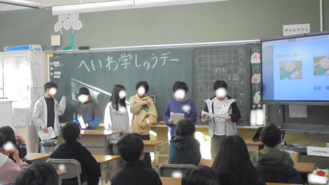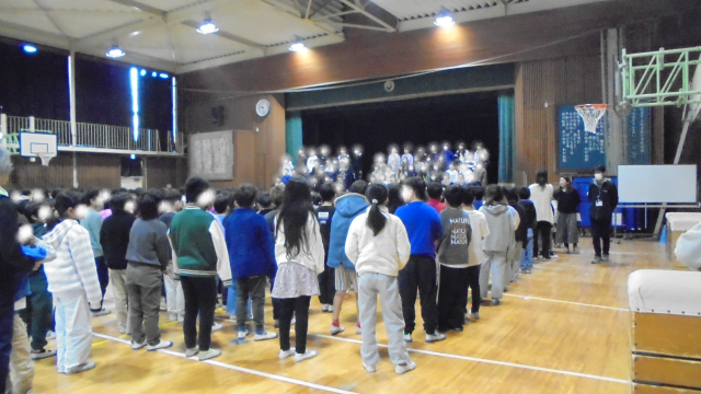 各教室での発表が終わった後、後半は、体育館に集合して、6年生が「平和の鐘」の合唱を披露してくれました。最後に、全校みんなで、「折り鶴」の歌を全員合唱しました。6年生が学習したことを下級生に届けてくれましたが、この平和学習デーをきっかけに自分たちの身近におこるトラブルについても考えるきっかけになればうれしいです。