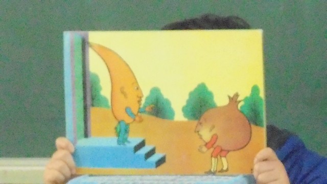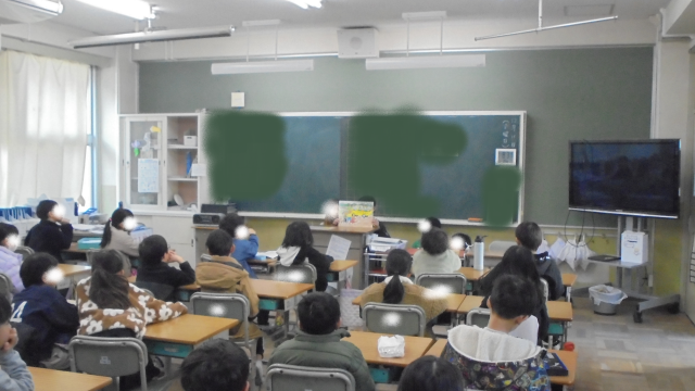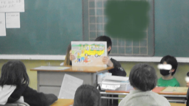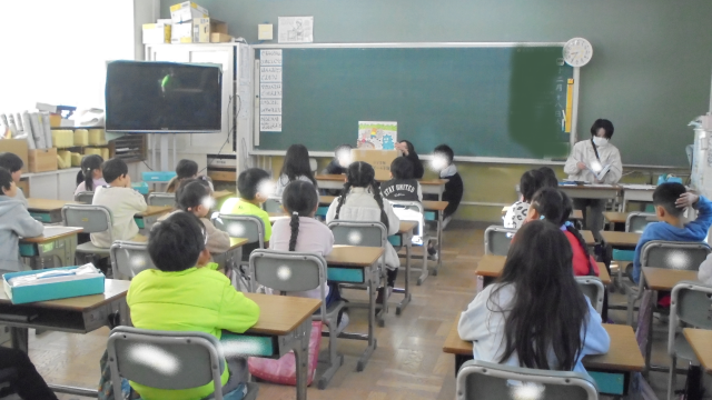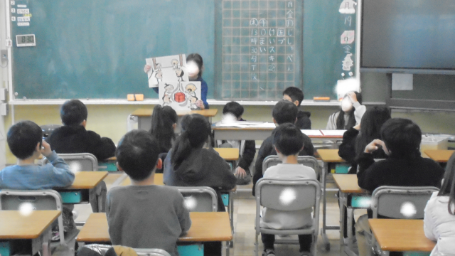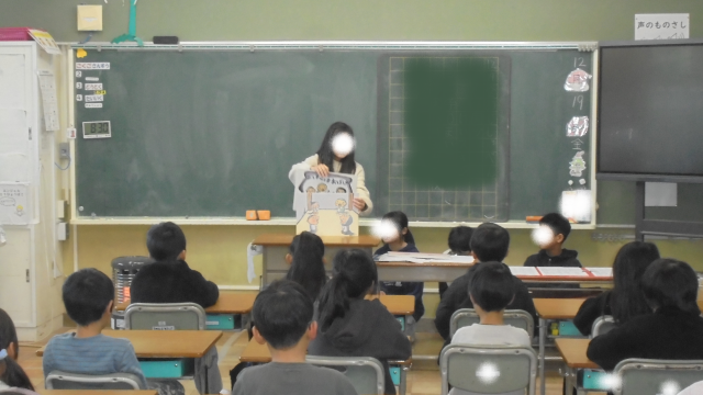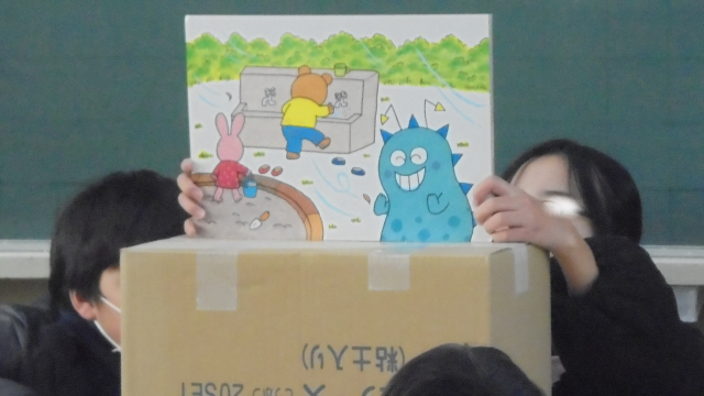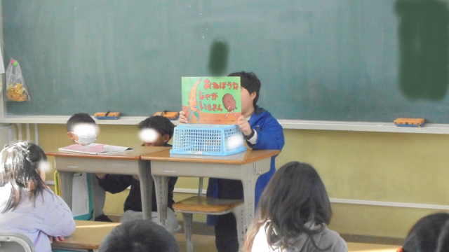 今日は、臨時の読書タイムでした。図書部会のお兄さん、お姉さんが紙芝居の読み聞かせをしに低学年の1・2年生の教室に