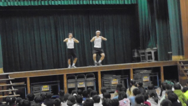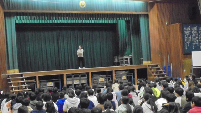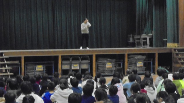 終業式のあと、全校でお楽しみ会をしました。事前にエントリーしていた子どもたちが舞台で披露しました。トップバッターは、なんと先生二人組です。一人で堂々と舞台に立つ子どももいて体育館はみんなの笑顔であふれました。