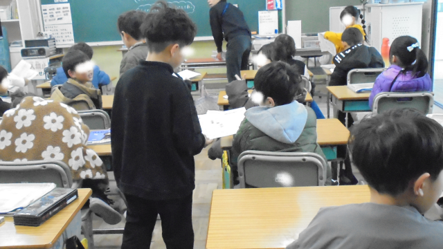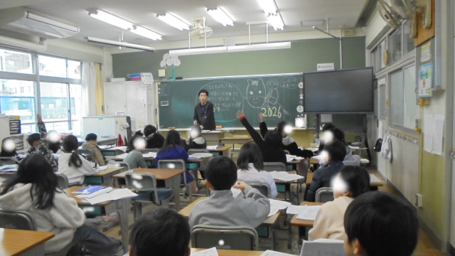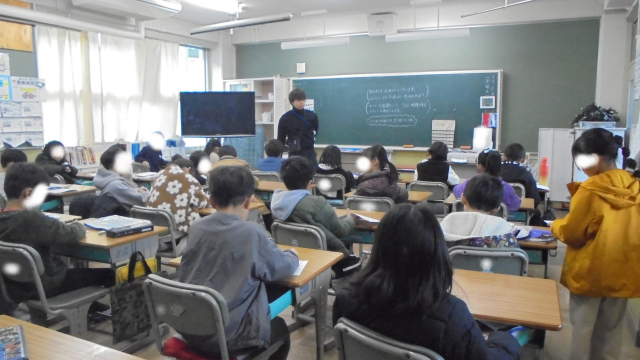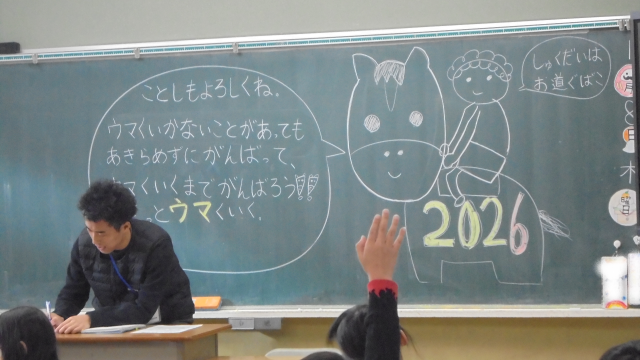2年生の教室の様子です。提出物を集めています。黒板には、先生からのメッセージがあります。