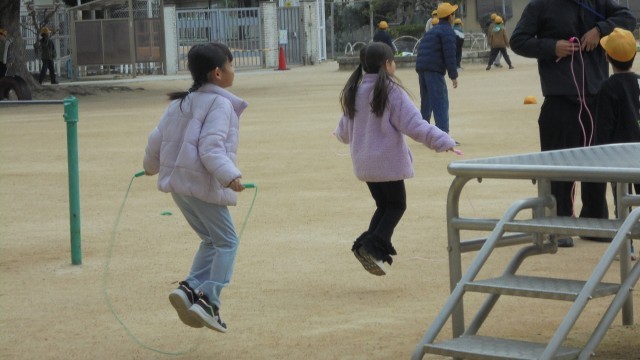 元気に遊んでいます。低学年は、縄跳びを一生懸命に跳んでいます。前よりもとても上手に跳べるようになっています。「先生~見て~!!」とニコニコ顔で声をかけてくれます。