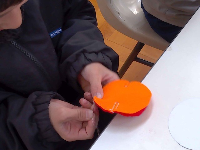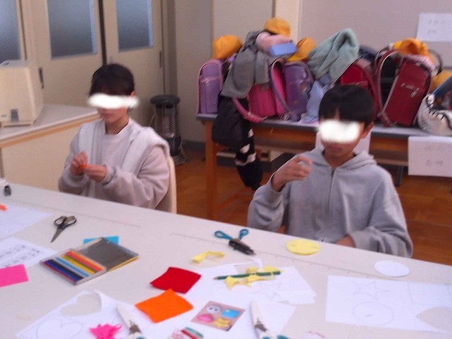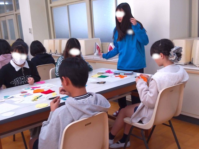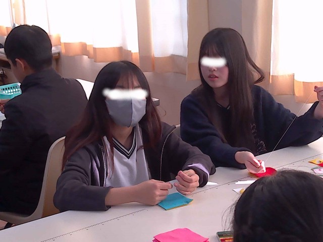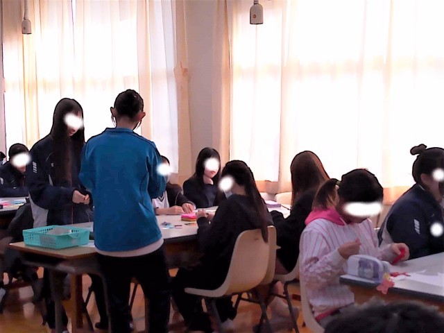 中学生の先輩が優しく丁寧に教えてくれています。がんばっています。