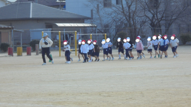 1年生の持久走の練習の様子です。寒い中ですが、みんな先生について一生懸命に走っています。思わず、がんばれ~!!と心の中で叫びました。