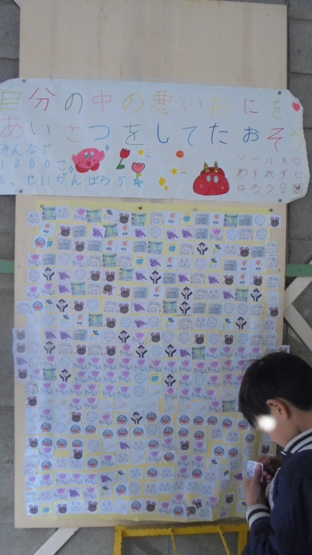 今週は、『あいさつ週間』でした。児童委員会の子どもたちが、みんなが元気にあいさつするためにと考えてくれた企画です。しっかりあいさつができたらシールがもらえます。みんな元気に挨拶してくれています。壁紙に貼られたシールの数が、みんながあいさつを交わした結果です。これからもしっかりあいさつをかわしていきkましょうね。