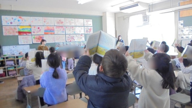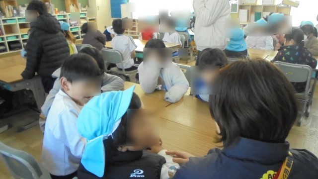今日は、阿保くすのき保育園の園児が松北小に遊びに来てくれました。まずは、1年生の教室で交流しました。歌あり、音読ありと少し上のお兄さん、お姉さんとして頑張っていました。