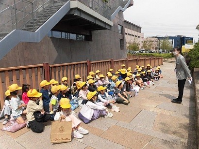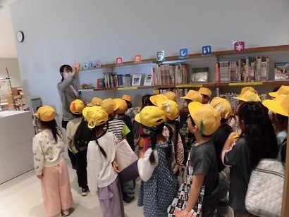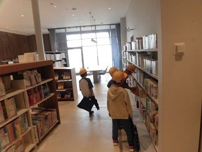 4月は学年ごとに読書の森を見学します。図書館の利用方法について学習したり、本を借りたりします。写真は2年生の見学の様子です。