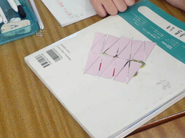 算数では、円の面積の学習をしていました。公式を使えばすぐに解けるのですが、小学校では、なぜ、そうなっているのかが大切です。公式を使う前に、自分たちで、どのように解けばいいのか、前に学習したことを駆使しながら考えていきます。