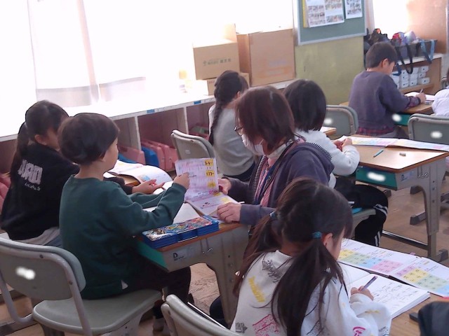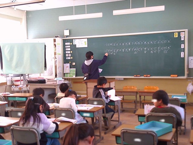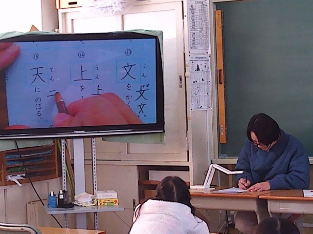 1年生の様子です。漢字の大テスト前の注意について聞いています。がんばってね。