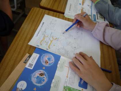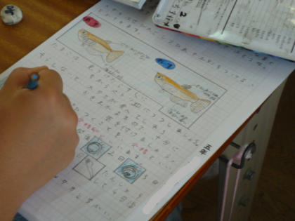 メダカの学習のまとめとして新聞を作っています。みんな上手に絵をかいて、学習したことやわかったことをまとめています。