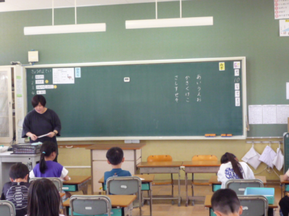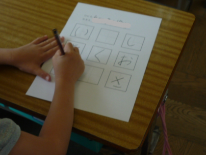 「前の黒板に書いたひらがなから選んで書いてね。」