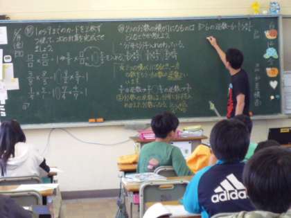 算数の計算です。二つの分数の積の答えが「1」になる計算を考えます。