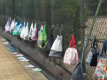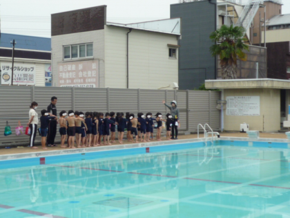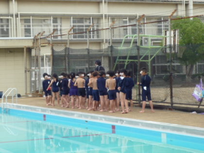 ルールをしっかり守って安全に楽しくプール学習ができるように先生からお話を聞きます。
