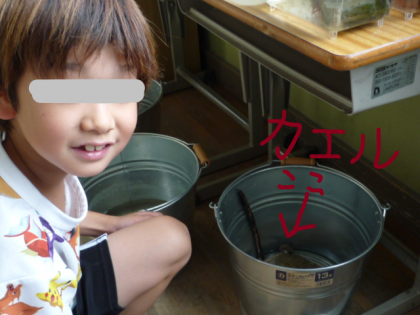 「先生〜見て〜カエルを捕まえた!!」見せてもらいました。