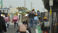 森之宮のバスの駐車場に少し早めについたので、トイレも済ませることができました。トイレの後は、整列して大阪メトロ 森之宮駅まで歩きました。5分ほどでした。行きは、子ども専用の4両編成の電車でした。松北小だけでなく、他の小学校も3校同じ4両編成の列車に乗りました。3校とも、100名ぐらいの学校でした。一つの車両に松北小1・6年生全員が乗れたので、良かったです。