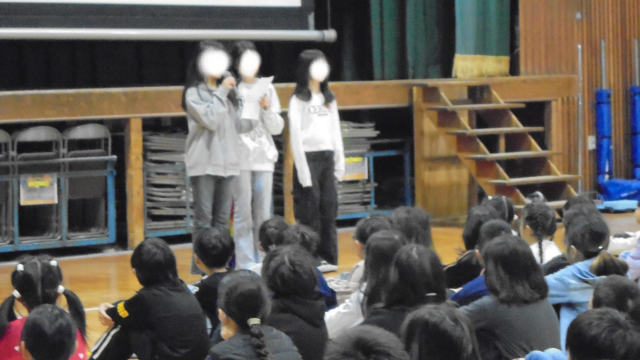 児童朝会の様子です。明日から6年生が修学旅行に出発するのを前に、出発式をしました。6年生の代表が、広島に行くことや平和について学んでくること、みんなが平和を祈りながら一生懸命に折ってくれた折り鶴を慰霊...