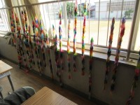 全学年から集まった折り鶴に糸を通して千羽鶴を作成中です。来週の出発に間に合いま...