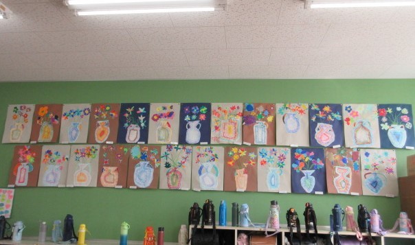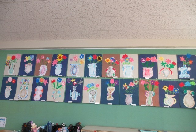 2年生の図工「ふしぎな花びん」の作品が出来上がり、掲示されました。様々な形やデザインの花びんにきれいな花が生けられていました。