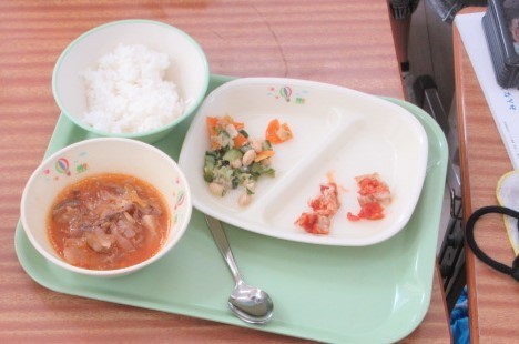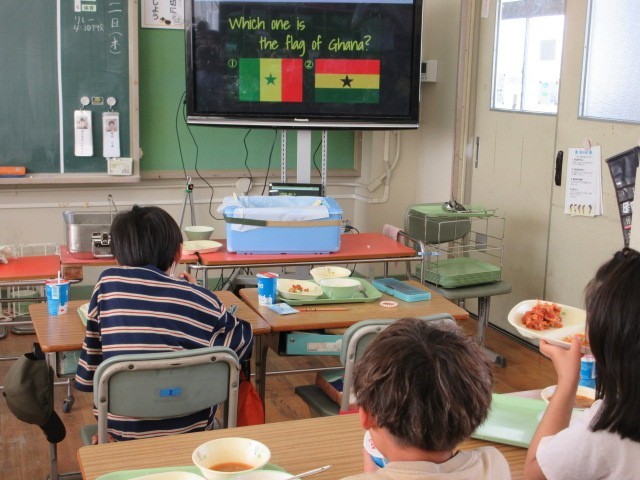 今日の給食はガーナのコラボ献立でした。チキンシチュー、ライトスープがでました。献立に合わせて給食時間にガーナの国の文化の紹介ビデオを見ました。